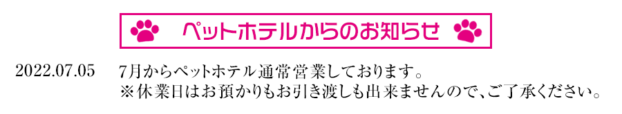 ※ペットホテルご利用中に、お客様のご都合でお預かり日を短縮する場合、キャンセル扱いとなり返金はいたしませんのでご了承ください。 |